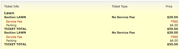 As you can see, the “service fees” were indeed waived, but the mandatory $6 “parking” fees associated with Nissan Pavilion are still in effect. Fees associated with printing your tickets at home are also waived farther down the checkout window, and the final purchasing stage didn’t produce any “facility” fees at Nissan – though that’s the only venue we’ve checked out so far.