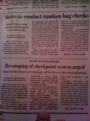Ironically — and hilariously — in the Post’s print version, the article is directly above a related article on security measures at airports. Check out the title — “Agony at the Airport: Revamping of Checkpoint System Urged.” The article discusses “an emerging consensus among experts and lawmakers that the checkpoint-heavy approach — searching nearly every passenger — may not be the most effective.”