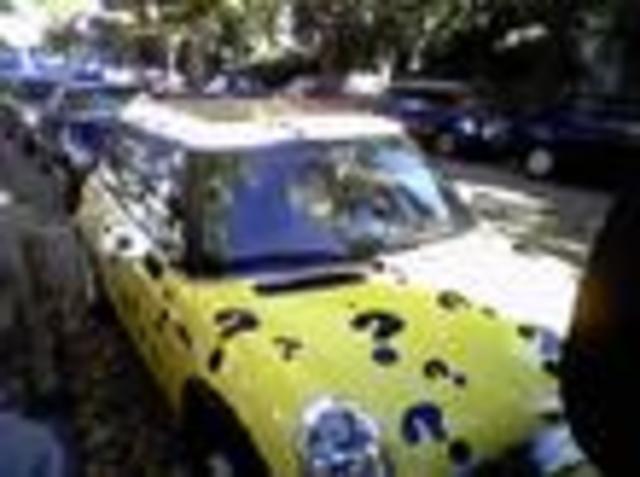 DCist told you earlier about the bright-yellow Acura (with magnetic polka dots) that infomercial celebrity Matthew Lesko drives around town. One commenter mentioned that there is a “question-marked yellow Mini Cooper that’s seen every so often on Conn passing through Cleveland Park.”