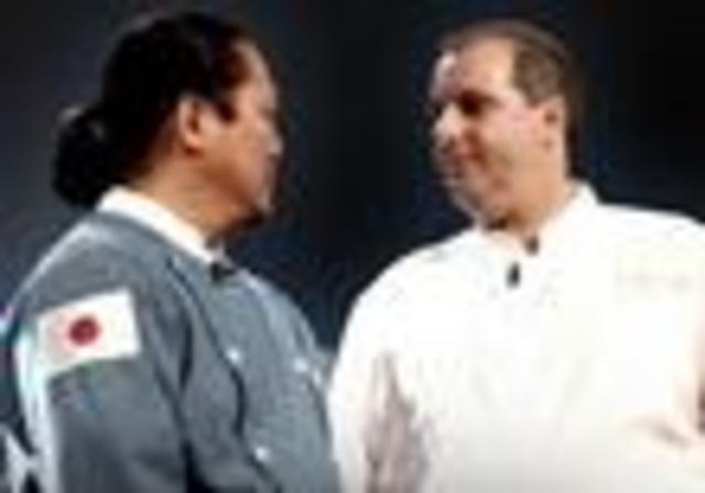 Clicking on our television, we channel surfed our way over to the Food Network, where local chef Roberto Donna, proprietor of D.C. high-end Italian restaurant Galileo, would be taking up the Iron Chef America challenge against Masaharu Morimoto. Though we would have been psyched for an Iron Chef Mario Batali-Donna-all-Italian throwdown, we settled in for an evening of what we assumed would be a well-matched competition. Galileo is, after all, apparently one of the top 25 Italian restaurants in the world!