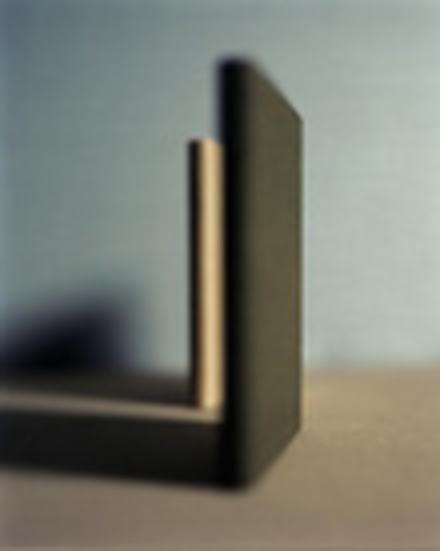 In the work Untitled (#37) (shown above), we see two books standing against a pale background. The books, one dark gray and the other a light taupe, recall urban landscapes. This minimal presentation signifies a certain dignity associated with the books. We are presented with the books at almost their thinnest possible orientation, but the wide, dark shadows resulting from the dramatic lighting of the scene gives the books power. The large size of the digital print and the highly saturated color aim to provide a significant presence. The size further aligns the work with the large-scale abstract paintings of the 60s and we cannot help but think of Barnett Newman’s “zip” paintings from around that same time.