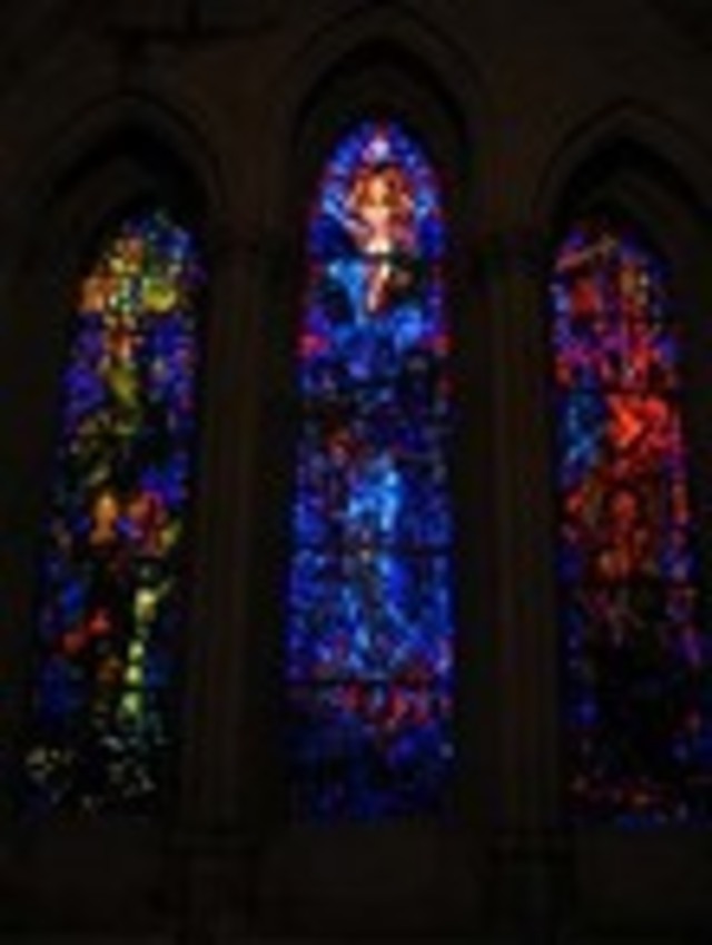 Synesthesia was a pretty big topic with arts bloggers a few months ago. For the record, it’s a clinical condition that involves the confusion of stimuli between different senses. Most importantly for our post today, some composers—Messiaen and Scriabin, to name two—have had this condition and perceived colors visually along with sounds that they heard (and, we presume, vice versa). This was the theme of a free concert that we suggested earlier this week in our Classical Music Agenda, featuring the 21st Century Consort at Washington National Cathedral Tuesday night. As venues go, this was a natural place to think about color and music. Synesthete Olivier Messiaen was profoundly influenced by a visit he made with his parents, when he was a teenager, to La Sainte-Chapelle in his native Paris. The late Gothic builders of the Sainte-Chapelle removed the supporting function of the wall to its maximum, leaving most of the elevation to be filled with stained glass windows. The effect, especially on a sunny morning or afternoon, can be hallucinatory. The windows shown here, in the nave wall by the tomb of President Woodrow Wilson in the National Cathedral, could probably have induced some strange chords in Messiaen’s eyes/ears.