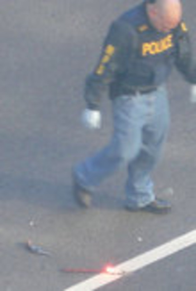 The police initially set up flares and a partial roadblock; now it looks as though the entire street is being closed. The cops don’t seem to be detaining anyone. There’s no indication of where the weapon may have come from, although a vehicle or a rooftop seem to be the most obvious candidates.