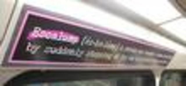 The ad campaign never much took off, with signs bearing the words and their definition appearing only sporadically on the system’s many trains. But yesterday we noticed that they had added a new word to the list, this one appearing on an Orange Line train: