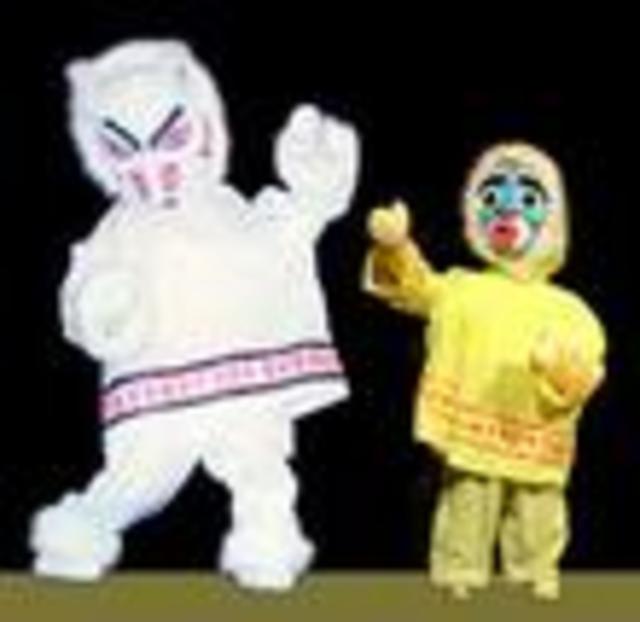 The show presents six stories from far-reaching sources, ranging from the ancient Greeks to the Navajos, in starkly different ways. “Prometheus,” a show highlight, is performed with an assortment of props taken from a golden suitcase which doubles as Pandora’s Box (you gotta love Zeus as a floating, Incredible Hulk head). The best of these is “How The Robin Got His Red Breast”, which features two day-glo Eskimos facing off against a monstrous bear with the help of a plucky bird, and some impressive-looking Northern Lights (Meat & Potato has already demonstrated its proficiency with neon and blacklight during an eerie reading of “The Raven” during its Poe 2000 show; it’s a weird niche, but someone has to fill it).