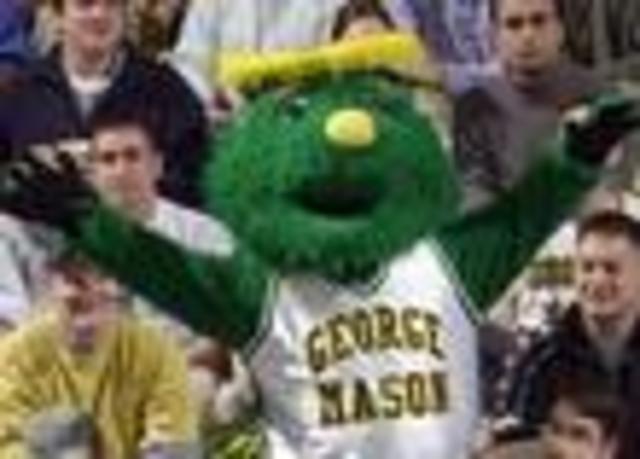 The George Mason University Patriots used to have a colonial looking fellow that led the cheers at sporting events, but it was felt that such a diverse school should not have a white male forefather type as a mascot. Instead, Mason decided to recognize its large and growing green muppet population, choosing as its representative the hirsute fellow seen at right. He’s called Gunston, after George Mason’s old home, and he became nationally recognized after the GMU basketball team donned a pair of glass slippers and sashayed into the Final Four. And now Gunston, the poor bastard, is unemployed.