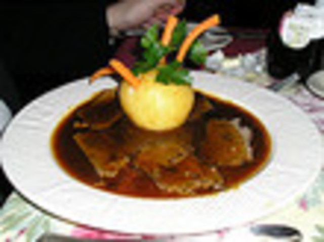 The meat used for sauerbraten was a bit tough, which made the substantial potato dumpling accompanying it a necessarily pliant foil. Too often, the sauce used in sauerbraten tends to err on the sweet side, but Café Berlin’s version had just the right amount of sweetness without being too cloying. And the potato dumpling served as an excellent vehicle for sopping up leftover sauce. Of course, when the supply of dumpling was exhausted, the crusty loaf of bread served our needs just fine.
