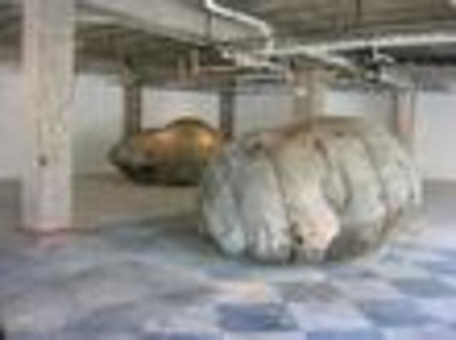 It’s Ledelle Moe’s exhibit, sponsored by G Fine Arts in collaboration with Metropolis, owner of the commercial space where it’s installed. Memorial (Collapse) contains three enormous heads hand-sculpted with steel and concrete. They lay haphazardly in the otherwise empty space, like relics one has stumbled upon in a once-great, but now deserted city. Perhaps a great capital city like our own, hundreds of years from now when the people have fled from some great catastrophe or massive political upheaval, and wanderers drift among the fallen heads of Lincoln and Jefferson.