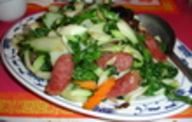 We find that it’s best to consult one of the waiters about a special that seems intriguing, as the perfunctory descriptions posted on the wall tend to leave out any references to all but the main ingredient. The best example of this phenomenon is the tersely worded “Sauteed Lotus Root,” which turns out to be accompanied by just about everything in the kitchen: sweet and spicy pieces of Chinese sausage, roasted fatty bits of pork belly, snow peas, carrots, scallions, at least two types of unusual mushrooms, menacing slivers of garlic, and, of course, the fibrous and Swiss cheese-holed slices of lotus root.