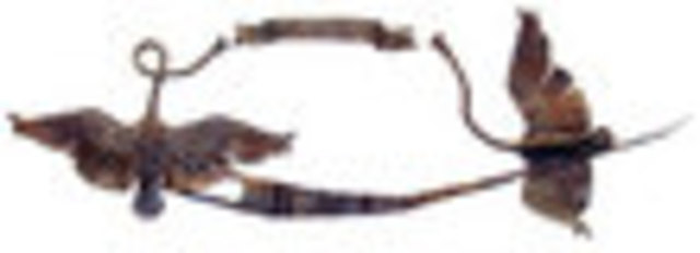 Reed’s rather literal subjects teeter on the peak of a slippery slope to kitsch. Herald (pictured) could easily be a quaint front door hanging, if it were carved out of wood and painted festive autumnal colors. Even LA, a life-size sculpture featuring a man clad in overalls, standing in a canoe and hanging onto a bird in flight with a rope that’s tied to its feet, could be minaturized and put on the shelf of a road-side gift shop in Podunk, Oklahoma. Yet, Reed’s ingenious use of materials saves each of these pieces from a terrible craft-store fate.