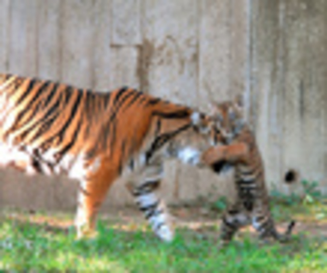 Now that the tiger triplets, Guntur, Melati, and Maharani, have made their public debut, they’re pulling out all the stops to steal poor Butterstick’s audience. Flickr user dcmandrill caught one of the cubs putting on airs for the crowd and annoying poor Mom. To get your extreme cuteness allowance for the day, check out the rest of his cub photos and — not to be outdone — Butterstick gets his own gallery here. Find the EXIF data for this photo here.