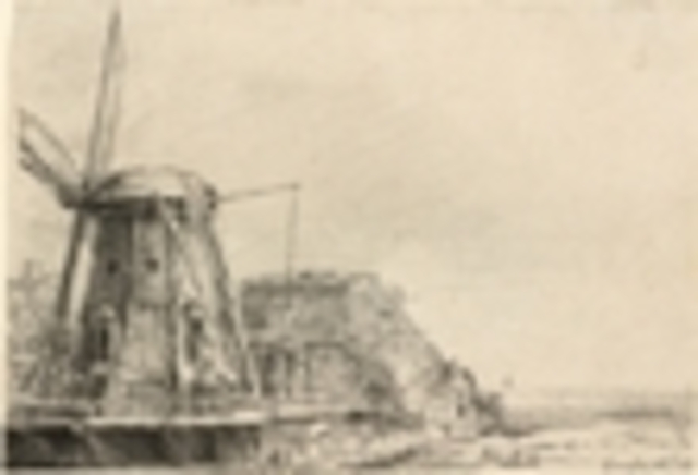 “The Windmill” (1641), an etching and sulfur tint on European paper (pictured), is one of the most interesting pieces in the exhibit. Rembrandt’s windmill is the sort we’d understand Don Quixote attacking; if you look closely, it could contain a face on its walls. Seeing so many Rembrandt etchings and drawings gathered together, it is hard to miss how well the master uses line to capture atmosphere. Rembrandt uses the pen and the etching needle so effectively that his work often exhibits the range of a charcoal sketch.