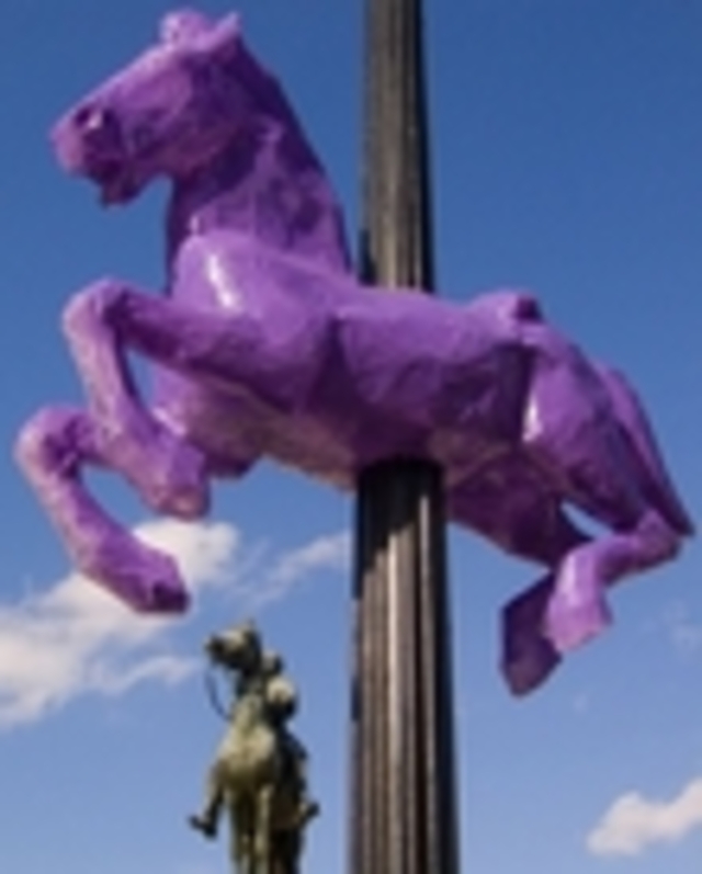 While most of us were inside this weekend trying to keep warm by regularly jumping up and down from the couch and shouting at the television, someone was out in Thomas Circle freezing his guerilla artist’s ass right off. Flickr user JamesCalder took this nice purple-packing-tape-meets-ton-of-bronze photo of the makeshift merry-go-round. EXIF.