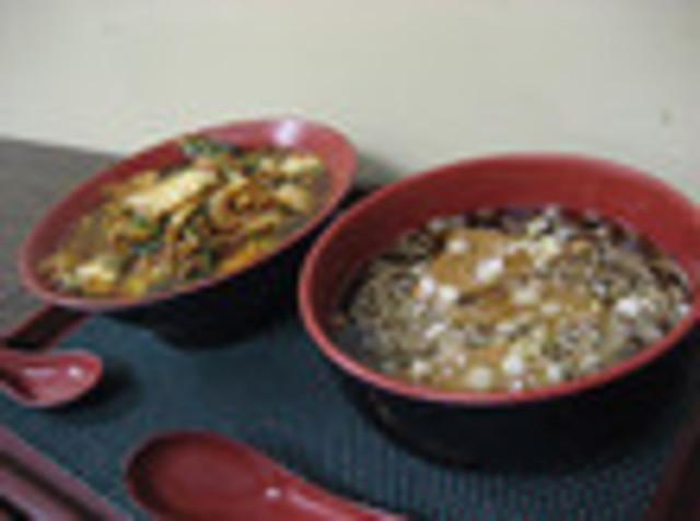 The two of us shared kitsune soba, katsudon curry, and kimuchi/kimchee ramen. The kistune soba is buckwheat noodles in a broth with scallions, leeks and thin sheets of fried tofu. The noodles themselves were cooked well, but they tasted as if they were from one of the packages of dried noodles lining the market shelves. The dashi-based broth (frequently used in miso soup) had a savory, slightly musty smell, but also a sweet teriyaki-like flavor that paired well with the scallions. The thin sheets of deep fried tofu were flavorful and well conceived; they had been marinated before frying, so they had a salty flavor that contrasted with the broth.