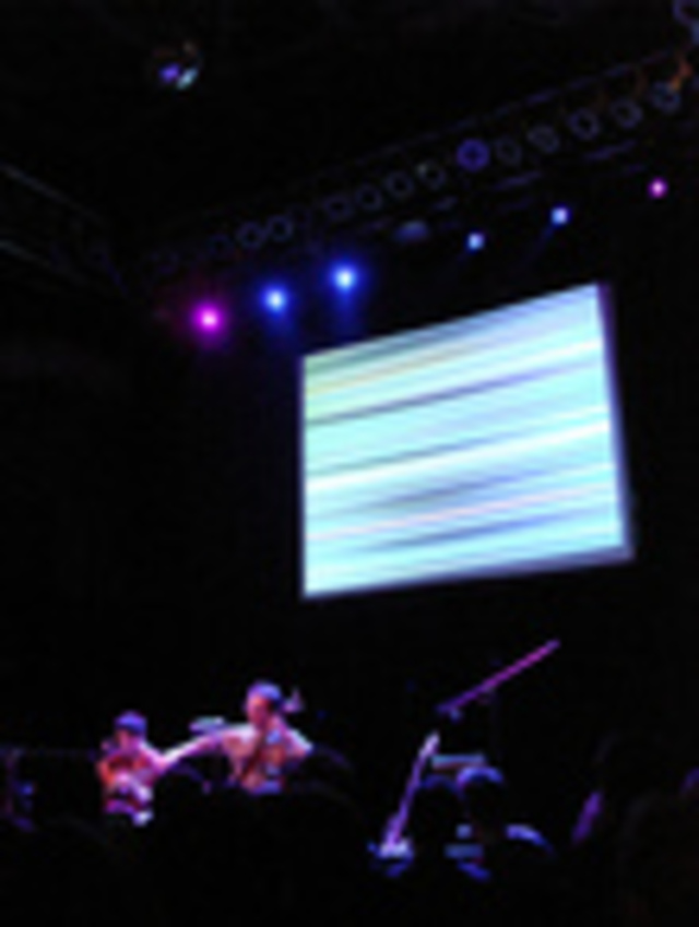 In concert, the duo sat on chairs below a video projection of sometimes abstract and sometimes spliced and edited clips from other videos. Even when Zammuto and de Jong were joined by a violinist and a guitarist (opener Todd Reynolds on violin and Zammuto’s brother on guitar), the audience naturally focuses on the video, which almost serves as an additional instrument. The videos are usually synced with the music, such as in the impressive “8 Frame” where every eight frames of video equaled a quarter note. And unlike other bands that show videos, such as Super Furry Animals or Caribou, the Books’ video is by design the most energetic performer — the musicians simply sit and make music.