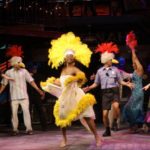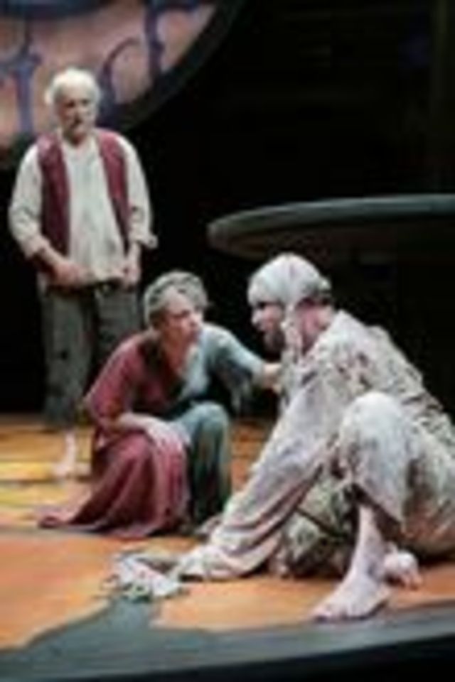 Tony Cisek’s set is comprised by six discs of various heights and sizes, one of which serves as the backdrop behind which Ariel spends the show imprisoned (a problem, since we can’t see her). Within these circles is a pattern suggestive of gearworks or the innards of a clock; a sly emblem of the fact that Prospero, the deposed ruler-cum-sorcerer at the center of the tale, is a man whose powers both of wizardry and of judgment, while remarkable, have their limitations.