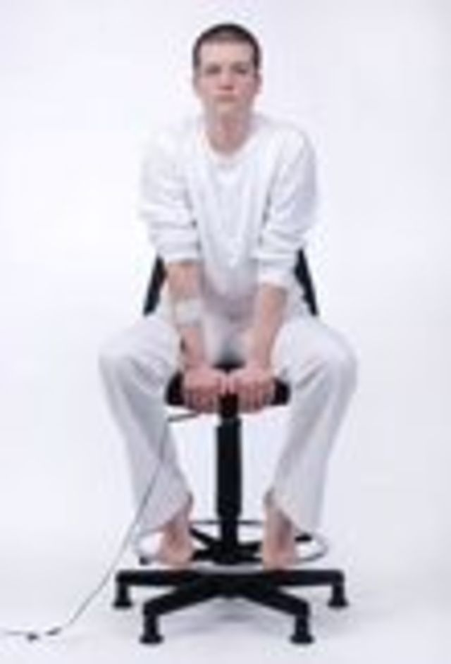 The collection tries to impart some of the pain and suffering of this therapy through multiple media. Located in the back of the room is the main piece of the exhibit, Aversion (Installation) 2007. The installation consists of a large black leather chair, a slide projector, small machine with electrodes, and a small table. The chair is very modern and feels very much at home as a modern piece of furniture within the simple clean lines of the gallery. It looks comfortable, plush and inviting, opposite of the two light blue electrodes on its seat, which are cold, hard and clinical. Their wires follow back to a small squat machine, the shock machine that is on a table next to the chair. A slide projector is behind the chair, loudly cycling through its carousel of erotic pictures. The display is disconcerting and ominous on its own — but this piece is actually the set for a performance as well. On the opening night of the exhibit, Coble had an assistant deliver a series electroshocks to her as she sat in the chair, alternately being shown sexy images of men and women. When she was shown a woman, she would get a shock.