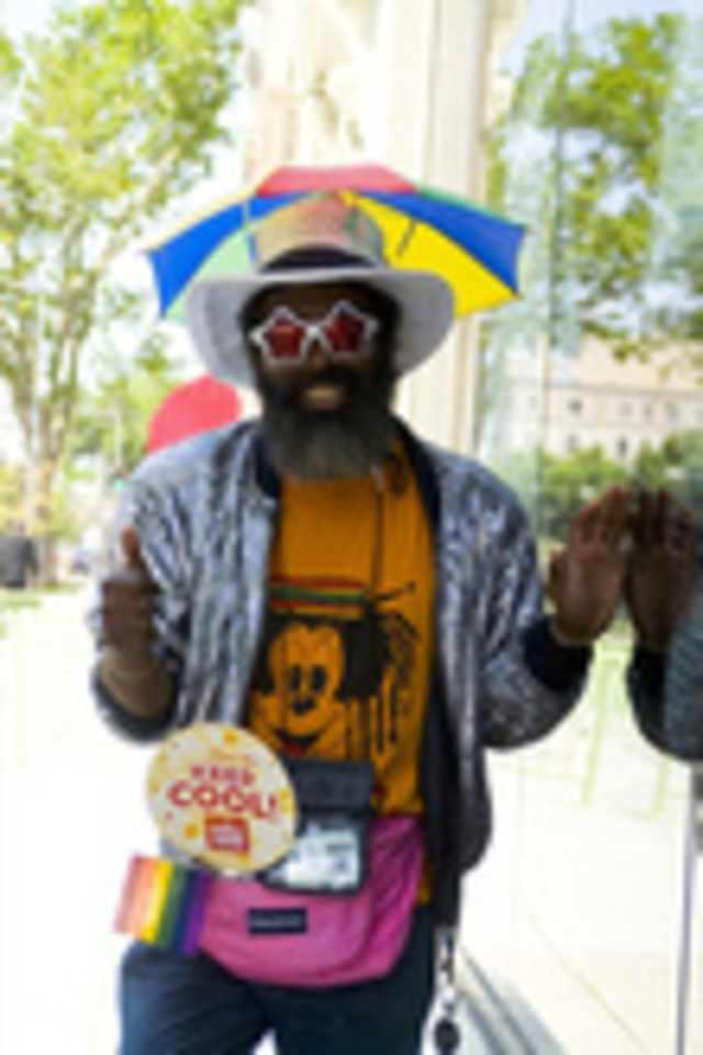 Capital Pride Parade given the rainbow flag and umbrella/hat. And it’s hard to tell from this photo, but Mr. Liberty also had bright blue pants and bright red shoes. We were happy to see