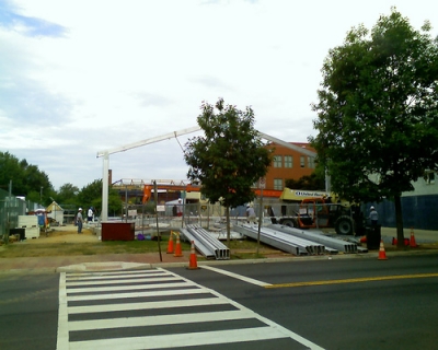 We had heard the Aug. 25 date earlier, but now it is the official opening day for the temporary market. Mayor Fenty originally promised vendors they’d have a new home by the end of July, but delays in construction caused by delays in steel manufacturing caused the frame to be erected late.