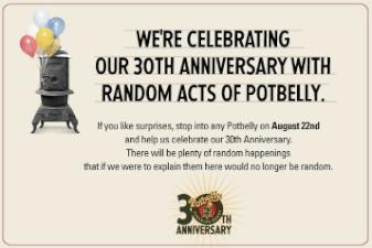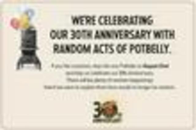 It’s annoyingly cutesy, but still potentially noteworthy: before you head out to grab your lunch today, consider that popular sandwich purveyor Potbelly is celebrating it’s 30th anniversary with something they’re calling “Random Acts of Potbelly.” Can we assume this will include random acts of giving away free sandwiches? Let’s friggin’ hope so. Because random acts of slaps across the face would be a lot less satisfying.