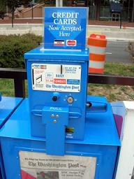 Via blogger dl004d we find that Post newspaper boxes at the Silver Spring Metro now accept credit cards. No longer will commuters have to fumble around for 35 cents, much less remember to take six quarters with them if they want to buy a Sunday issue.