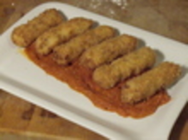 We fianlly decided to go with the fiori alla trasteverina ($6) and the crocchette Emiliane ($4). The “fiori” were delicious fried zucchini blossoms stuffed with ricotta cheese and prosciutto. As an added touch to the presentation, batonnets of zucchini were fried and laid beside the salad. We would have done this for Eating In, except we did not want to send you all on the dubious mission of trying to buy squash blossoms. So, this week we will be making Potato and Prosciutto Croquettes with a tomato dipping sauce. We used our deep fryer for these, but if you do not have one, you can use a small pot filled with oil. This recipe can easily be doubled to serve at your next party.