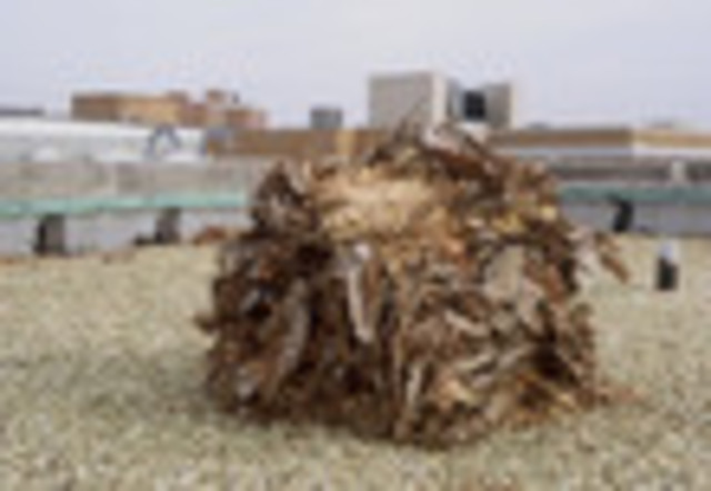Carrie Mallory’s series of four untitled chromira prints demonstrate this most clearly. The four 24” x 36” photographs document Mallory’s “box” series installations in which she forms cubes of yellow and brown leaves on top of an urban rooftop. The cubes are shot in a way that makes them appear large and imposing, however the leaf-cube proportion hints at an estimated overall size of just two feet cubed. The contrast between the forcibly-shaped dying leaves and the drab rooftop form an interesting series of photographs which urge the viewer to ponder man’s influence on nature.