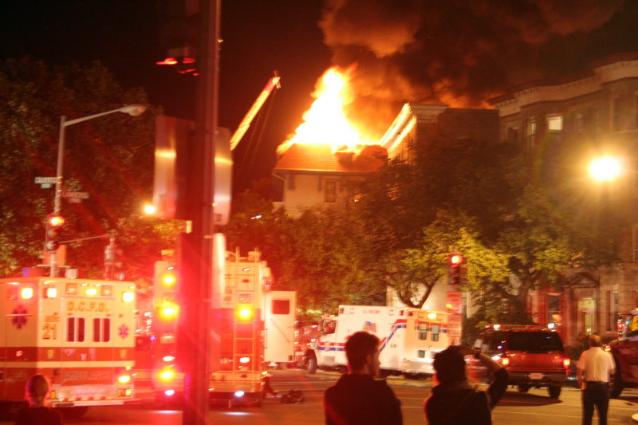 Firefighters took almost eight hours to put out a four-alarm blaze overnight in Adams Morgan on the 2600 block of Adams Mill Rd., across from Pierce Park. The fire started at about 1:15 a.m., gutting a four-story apartment building and displacing residents of more than 30 units.
