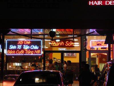The first thing one notices upon entering Eden Center is that you feel like you’re in a foreign land (just don’t look at the building supply liquidators to the right or the Guitar Center behind you). The community feeling is evident in the Vietnamese street names assigned to the parking lot rows, and the seemingly endless array of restaurants and cafes. We had a bit of difficulty finding Thanh Son (something to do with the website, perhaps?) and even had a brief flicker of “Good Lord, here I am specifically seeking out a restaurant to blog about and it’s not even open. So much for the information superhighway.” Finally, the mystery was solved once I exited the car and walked around. Turns out that Thanh Son’s facade neon sign wasn’t working, which doesn’t exactly make the storefront stand out from far away, or even as you drive right in front of it.