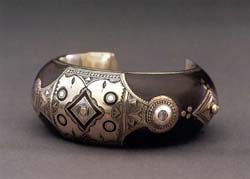 The Tuareg number between 1 and 1.5 million, and reside in an area that includes southern Algeria, southwestern Libya, Mali and Niger. Unlike many Muslim societies, the men wear veils and not the women — the Tagelmust is an indigo veil worn by men that stains their skin blue and defines their identity, giving them the nickname “Blue People.” They live in a stratified society divided into nobility, tributary groups and the inadan — classes of religious leaders and artists — who are the focus of the exhibit.
