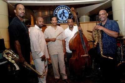 >> This week’s first must see takes place tonight at Blues Alley as one of the area’s finest drummers, Nasar Abadey, takes the stage with SuperNova (pictured right), a local jazz supergroup. The band features Allyn Johnson on piano, Gary Thomas, Jazz Studies Chair at Peabody, altoist Joe Ford, and bassist James King. Sets are at 8 p.m. and 10 p.m. $18 + $10 food/drink minimum. Tickets available here.