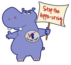 Voting rights activists protested outside the Washington Hilton this morning, hoping to catch a glimpse of John McCain and express their displeasure at his recent vote against cloture on voting rights legislation that would have moved legislation forward to grant the District a voting seat in the House. Among the activists were two dressed as hippos, part of D.C. Vote’s new “Hippos Follow Hypocrites” campaign. And as they did with McCain, the hippos plan on hounding other senators that voted to uphold the filibuster, with an eye towards re-introducing the legislation early next year. The hippos may even follow certain senators to their home states and key primary states, as well as present themselves at their Washington offices to press the voting rights cause.