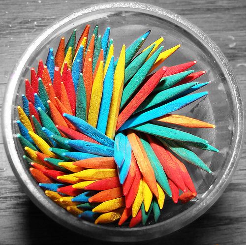 We’re happy to finally have a few days of rain ahead of us after the long summer drought — though we’d gladly donate it to our left coast friends if we could. Sometime around about Friday though, after days of dreary weather and wondering if there is still a sun behind all those clouds, we’re going to need a splash of color. Thanks to rsplatpc, you may now refer back to today’s photo of a cup of colorfully arrayed toothpicks to give yourself a break should the march of gray skies start to get to you. EXIF.