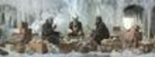 Much of the work on display features the notgeld, which was given to German and Austrian citizens by local banks after World War I, and became practically useless due to rising inflation after the war. In Cardgame (pictured above, detail), three men play cards in the center of the 72 inch long photograph, surrounded by wooden crates, torn suitcases, boots and hats, all overflowing with countless bundles of notgeld. Dressed in long coats and fur, and wearing stone-carved masks depicting unknown animals, the men sit on crates amidst an ominous icy landscape.