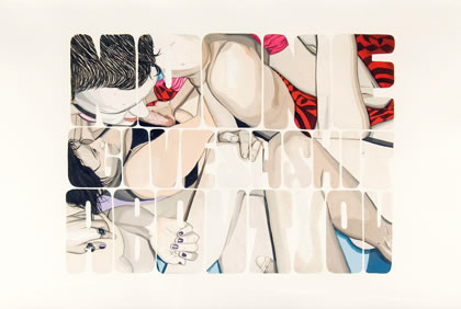 Lou Laurita’s two displayed gouache on paper works, The Caveat and The Blind Spot (pictured above), mix skillfully painted orgiastic imagery with obtuse bubbled text that reads, “You are an American visionary” and “No one gives a shit about you,” respectively. Depending on one’s affinity for text versus imagery, it is either the text or the image that is difficult to comprehend at first glance. According to Laurita’s artist statement, his work references the various web site profiles that one creates to identify oneself, which are often asking for various things — “to dominate or be dominated, to maintain control or succumb … or maybe just a dinner out.” While the text in his work gives us an insight, it also forms a barrier between the real and the perceived, much like the web identities he references.
