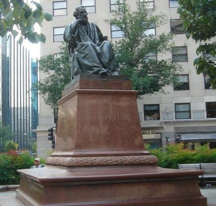 And yet for all the pomp with which it was dedicated, when DCist went to see this monument of Henry Wadsworth Longfellow one recent evening, we could hardly see him. The man described as “the joyful, enthusiastic mouthpiece of what was best in his time” sits unlit, alone, and stranded on an island in the middle of the noisy intersection southeast of Dupont Circle.