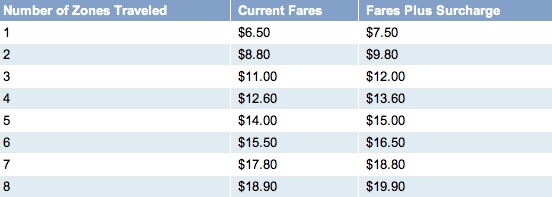 Since the switch to time and distance meters won’t happen until April, we’ve pasted the zone chart with the $1 fees added below. If cab drivers ask you for an additional dollar starting today, they are well within their rights.