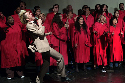VanAlkemade’s film follows the Reverend Billy, née Bill Talen, an actor who got so fed up with the Disneyfication of Times Square a decade ago that he added a white collar to his catering uniform and began preaching the anti-Disney (and soon, anti-consumerism in general) gospel on New York Subway platforms and in guerrilla protests in stores. He gained a following, further developed his character, complete with a bleached-blond and securely Aqua-Netted televangelist’s pompadour, and is now the head of a fully functioning non-profit, plus a gospel choir and band nearly four dozen strong. In 2005, the group embarked on a month long trip all around the country (on two bio-diesel buses), culminating in a march through Disneyland’s Main Street U.S.A. that got Talen arrested and banned from all Disney facilities for life. Cameras followed them from start to finish.