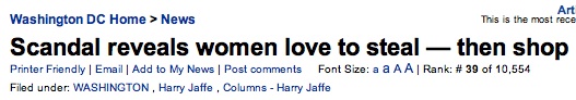 The thinly veiled sexism oozing out of today’s Examiner column by veteran local politics observer Harry Jaffe is hard enough to take, but to whomever thought up this gem of a headline, be they copy editor or author, DCist salutes your willingness to go boldly where no human beings in the 21st century were thought to be capable of going anymore. Yes, if the recent Office of Tax and Revenue scandal has taught us anything, it’s that the greed of an entire gender is to blame. Women totally are always shopping, and these two women were both arrested for stealing and then shopping, ergo, all women love to steal and then shop. I know I do! I’m talking LOVE here.