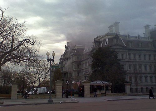 MORE, 10:09 a.m.: The fire reportedly began in an electrical closet adjacent to the Vice President’s ceremonial office in the Eisenhower (which of course he never uses). The smoke has all but stopped coming out of the building now but it remains completely evacuated and likely will for the much of the rest of the day.