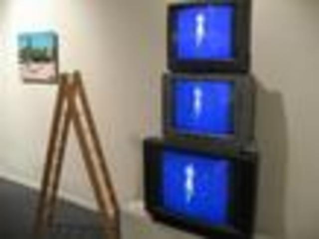 The tipi, which Scout once used for shelter, dominates the gallery. It is draped in caution tape and is constructed with PVC pipe, a very modern material. Amateur picture collages of his rewilding journey are set against bright neon backgrounds. Cases containing his tools are displayed like in the Natural History Museum, with the tools laid out in a glass case with a corresponding “map” naming the instruments.