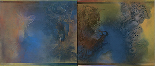 He made A Place: Suspended with acrylic paint on cotton canvas, and estimates that a painting like it would take two to three weeks to complete, since he works on more than one at a time.