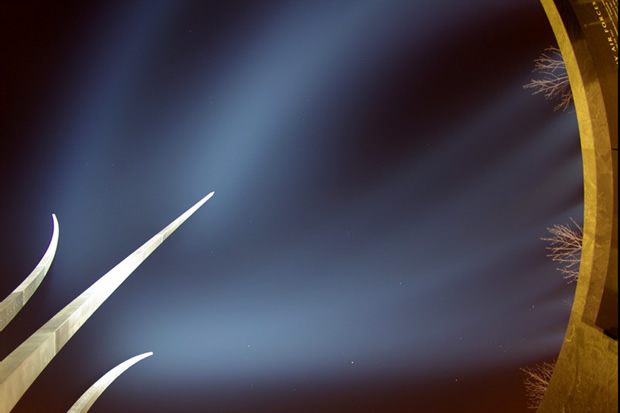 Philliefan99‘s photo of the Air Force Memorial is particularly interesting, not only because of the effect of using both a fisheye lens and a long exposure, but because of the constellations one can make out in the sky, including Mars, Casseopeia and Orion. EXIF.