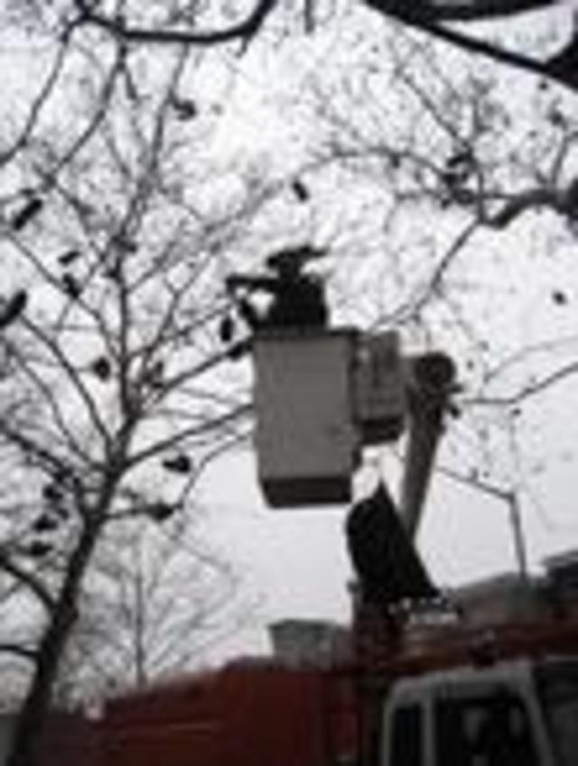 District Department of Transportation workers this morning removed dozens of shoes that had been flung up in two trees in the 400 block of Q Street NW.