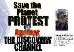 Sometime last week a friend of DCist sent in this rather hilarious web site promoting what appears to be a one-man crusade and protest against the Silver Spring, Md.-based Discovery Channel. As you can see, the singularly named “Lee,” with his faux-tough mug shot and all-caps, is dishing out a little of the old insane rambling on the cable network to promote his “Save the Planet Protest Against the Discovery Channel,” which the web site says is planned from 9 a.m. to 9 p.m. for the entire week of February 15—23, 2008: