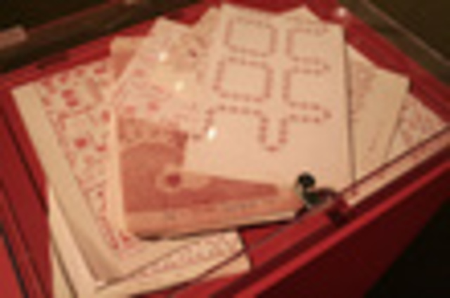 Daniel Levinas selected Argentinean artist Leon Ferrari, who recently won the coveted Golden Lion Award at the Venice Biennale. Ferrari creates the world’s largest mail art –unfolded burgundy-inked blueprints hung with black binder clips. The work is intended to be copied, folded and mailed worldwide. “Bairro” depicts a neighborhood viewed from above, complete with gardens, bedrooms, furniture, and people milling about among linear and curved wall divisions. The blueprints, which represent the political and military oppression in 1980s Argentina, appear innocent from afar. However, the details reveal oddities. In one area, approximately fifty seated men and women watch an empty bed surrounded by a horseshoe of panelists. In other areas, individuals walk in single file with little interaction, winding through mazes of bathtubs, beds, desks, kitchens, cars and toilets. While the artist is depicting a particular historical period, the work also relates to the seemingly aimless but orderly nature of humans as we go to work, obey traffic laws, drive en masse, and conform to societal rules.