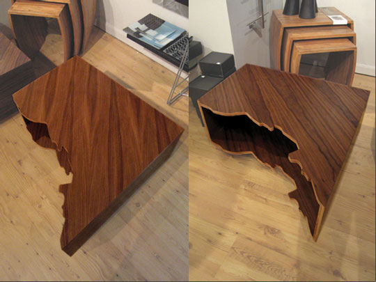 Via Apartment Therapy (hat tip to reader Sara B. for the link), we couldn’t help thinking this was pretty rad: local furniture designer Justin Couch (could that possibly be his real name?) is selling custom coffee tables shaped like the District of Columbia. Available in black and white formica as well as the walnut ply finish pictured above, this could be just the accessory those of you who’ve worn out your three stars/two bars T-shirts need to complete an entirely pro-D.C. aesthetic. Although, the “District Table” runs $600 plus any shipping costs, so you’ll have to be a little more financially solvent than most of us layabout bloggers to afford this sort of Washington-focused extravagance. Maybe one of you wealthy readers would like to donate one to DCist headquarters? If we shouldn’t have one, we don’t know who should!