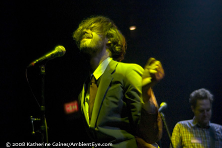 When the lead singer of a band comes into a show recovering from both a back injury and some alien death virus, this doesn’t bode well for a good performance. When the aforementioned band, California’s Liars shows up on the night of a heinously awful fall-causing ice storm, that doesn’t bode well for a large audience. Suffice to say, Tuesday night’s show was not the cult-building stuff of legend. There was no equipment climbing, no odd wardrobe choices, and no true freakouts. So Liars had to make do with what they had: an intensity that defies injury, a room full of truly dedicated fans and a setlist full of noisy tinny percussion and primal screams that could inspire blind rage (or at least perpetual fist pumping) from your average mild-mannered cubicle neighbor.