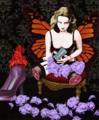 While working at an adult film company, JoKa found a plethora of old Playboy magazines, which he now uses for reference. The woman in Wings Don’t Need Legs (pictured) was found in these magazines; she sits contently in the painting with her amputated legs, sprouting butterfly wings, and lovingly stroking the butcher knife dripping with blood, while a large high heeled shoe burns. It is one of his more overtly dark paintings, both in color and theme.