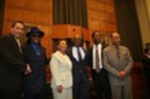 Photo courtesy musicFIRSTcoalition. From left to right, pictured are Rep. Mel Watts, Chuck Brown, Rep. Barbara Lee, BeBe Winans, actor Isaiah Washington, and Rep. John Conyers